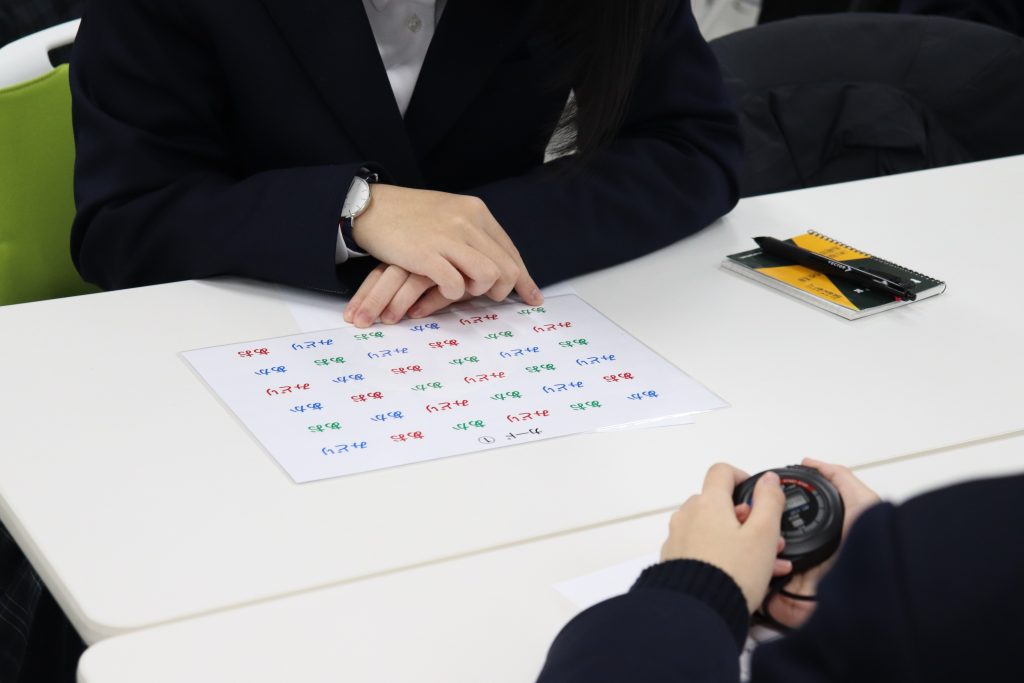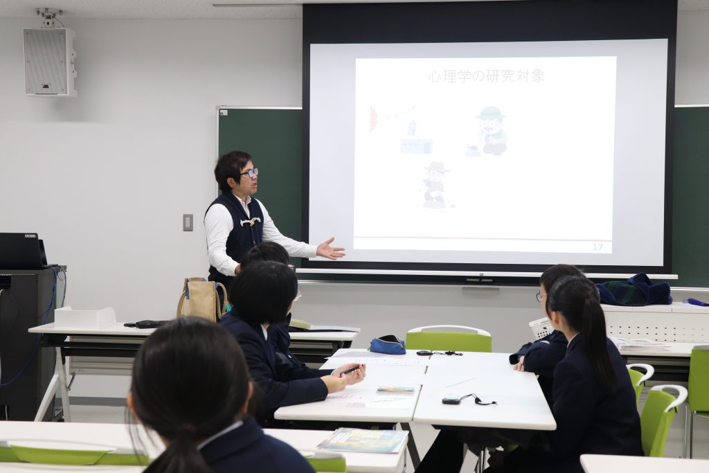 さらに、大学の学びを体験するため、心理・カウンセリングコースの木戸先生による模擬授業も実施。ストループ効果の実験を行い、心理学がどのような学問であるかを知っていただきました。